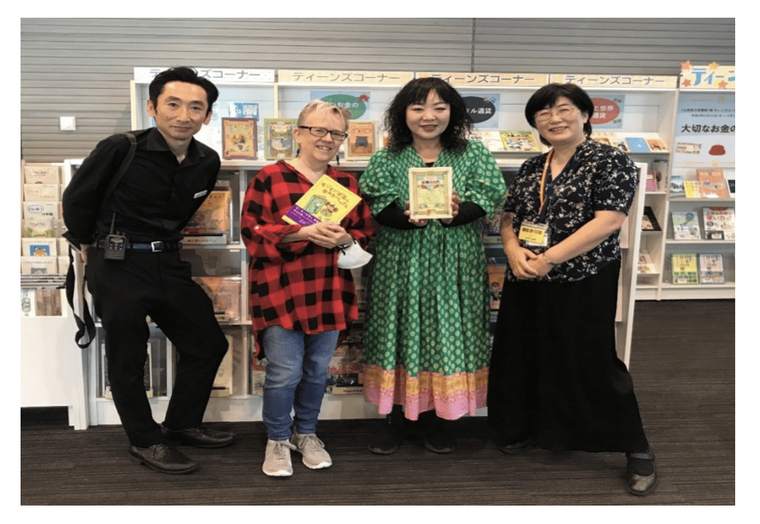 With Sachiko & librarians in front of stand with library copies of my books. Sachiko & I hold each other’s books.