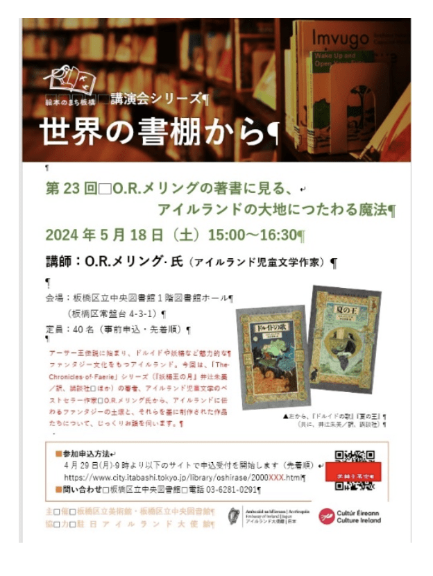 Host: Event co-ordinated by Aisling Braiden of the Embassy of Ireland in Japan, who provided an interpreter, and Matsuzaki Eiji, Central Library Director and Umesato Yuko, Book Section Chief.