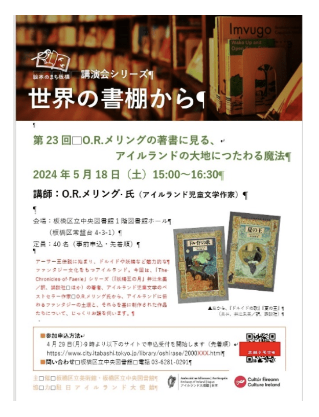 Host: Event co-ordinated by Aisling Braiden of the Embassy of Ireland in Japan (who provided an interpreter) and Central Library Director, Matsuzaki Eiji and Book Section Chief, Umesato Yuko.