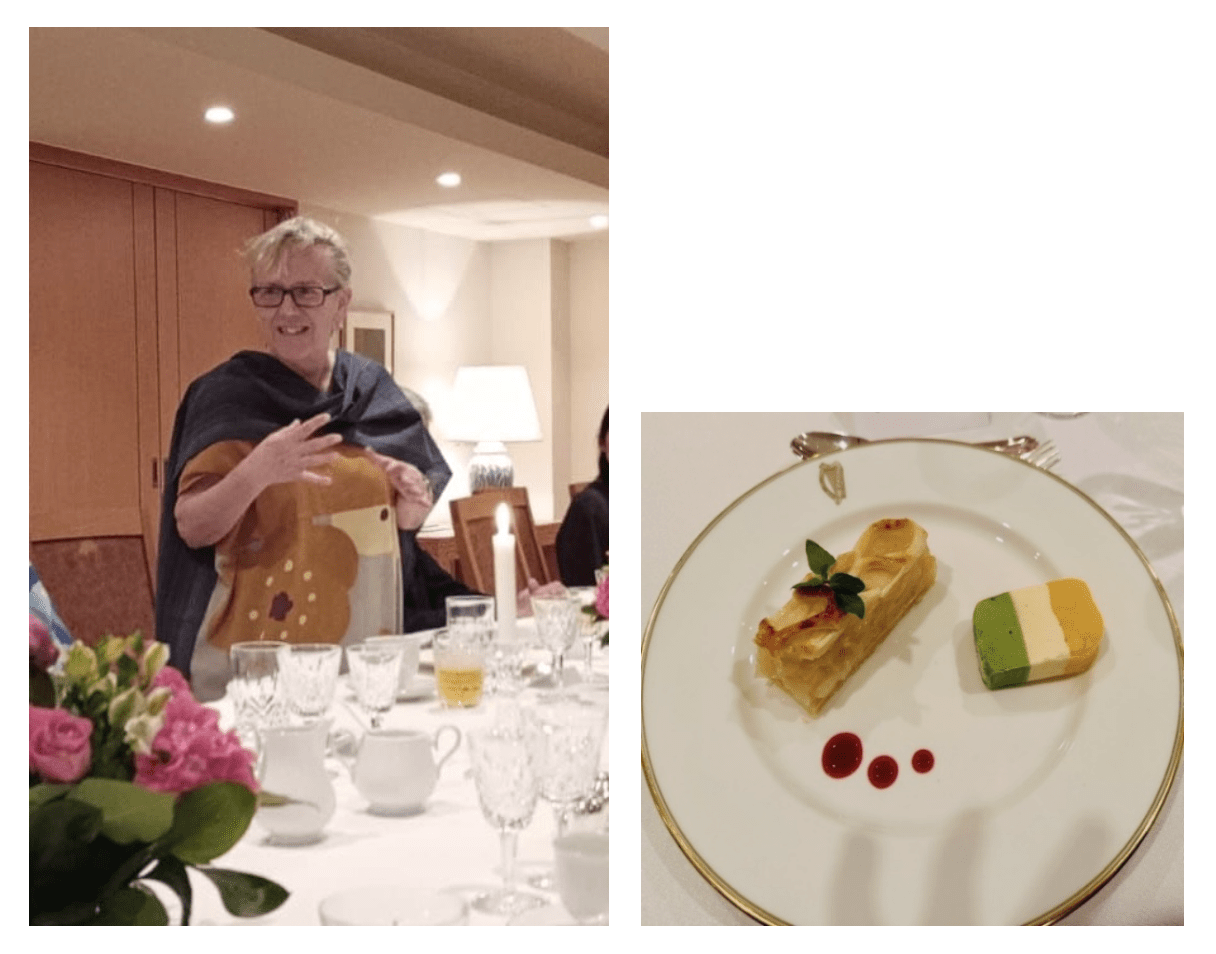 Thank-you speech in Irish, Japanese and English. Dessert with ice-cream in colours of the Irish flag.