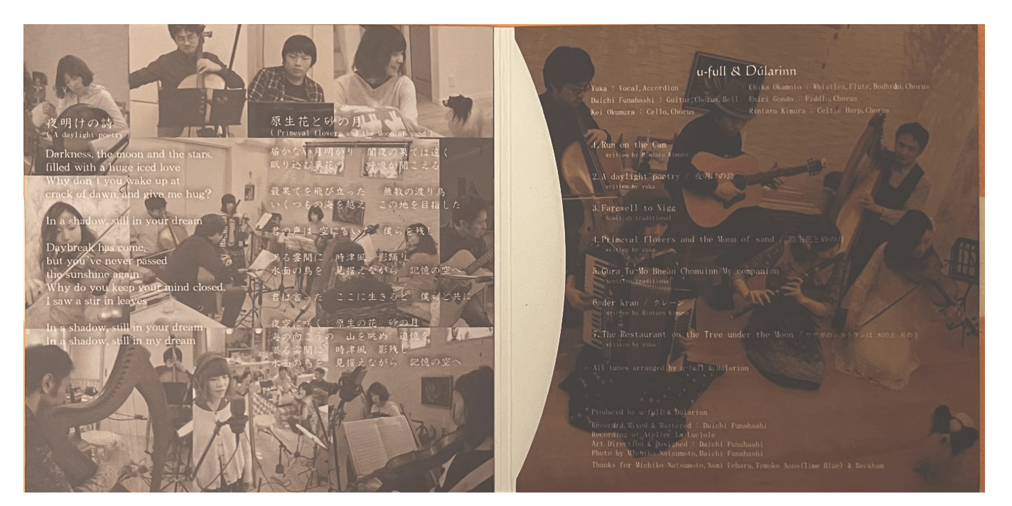 As of 2024, U-Full have released seven original albums, a live CD, and a live DVD & Blu-ray, as well as numerous other works, including a mini-album produced as a special album, “The Lake-EP-” which includes Irish recordings, and collaborative albums with the Celtic group Dúlarinn, “a small ember” and “Hearken to the Wind.” (Website Biography)
